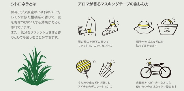 五顏六色的紙膠帶,除了能夠裝飾手帳,做卡片,佈置房間之外,現在又多了一個新功能-當成「防蚊貼紙」使用。日本小物品牌「masté 」4月10日起發售可以防蟲的紙膠帶系列「アロマが香るマスキングテープ」。加入蟲子討厭的天然藥草-香茅,具有防止蚊蟲靠近的功效,聞起來就像清新的檸檬味。長度40公分左右的紙膠帶,味道可持續6小時。