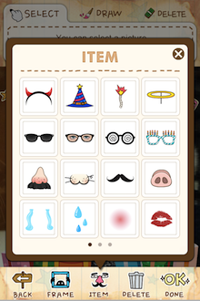 拍完照片就進入亂塗亂畫的時候囉!先來試試下方的框框,共有三頁選擇,挑選一個你喜歡的吧!不要框框要回來選「No Frame」喔,不然消除不掉。貼紙都是一些很kuso的風格,也有三頁任君挑選,不喜歡就用旁邊的「Delete」消除;上方則是畫筆,敏感度還算 OK,也可以調整粗細。