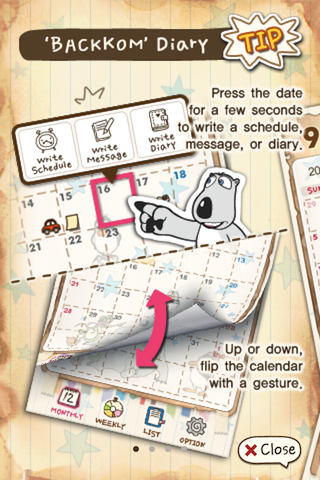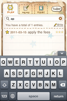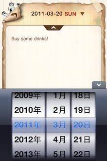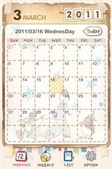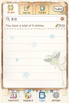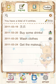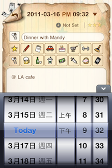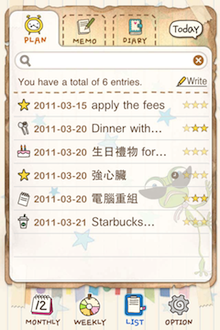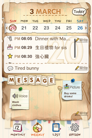 快在空白的行事曆新增事項吧,可以依照月份瀏覽,手指上下翻動即可到其他月份,或是下方選擇「週次weekly」、「列表list」跟「選項設定Option」。長按想新增事件的日期, 就會跳出浮動視窗,共有三種選項:「新增行事曆」、「寫待辦事項」跟「寫日記」,手寫字體是不是很像手寫本本的感覺呢?