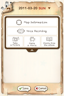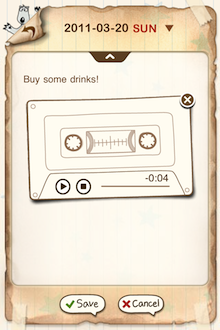 錄完以後出現的是手繪風格的錄音帶塗鴉,可以直接在記事裡重撥。照片裡也可同時包含地圖資訊,這樣要順手記下某家商店或是某本需要買的書,是不是就變得很方便呢?