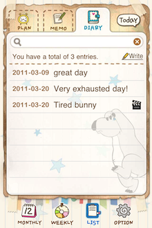 剛剛看過了月份瀏覽,現在來到週次瀏覽,上方畫圈圈的是今天,左右點選不同日期進入。下方按照行事曆的設定時間排列顯示前三則,可上下滑動瀏覽,日記則只顯 示當天新增的第一則,其他日記要使用列表功能才能看到啦。下方待辦事項則像便利貼一樣,可自由移動位置,想要刪除時,只要把它往外拉就OK。