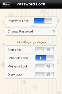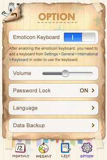 進入選項來作設定吧,有使用表情符號可選擇是否開啟,音效的音量調整也在這邊,另外可選擇密碼是否開啟,密碼部份可針對開啟程式或各個類別做設定,語言、格式化及一開始的教學也都在這邊。Data Backup也提供在iTunes裡作備份的功能,相當簡單好用!