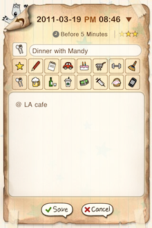 進入新增後,在上方選擇時間,填入主題、內容等,接著選擇一個可愛貼紙標注,等等在月份瀏覽就可以看到囉~鬧鐘則不是直接設定時間,而是每點一次變換成不同間隔;這件事情有多重要呢?可以用星星來標注一下。結束按save儲存,不小心按到左上返回,可不會儲存的喔!Woala,剛剛我們選擇的用餐貼紙顯示了。