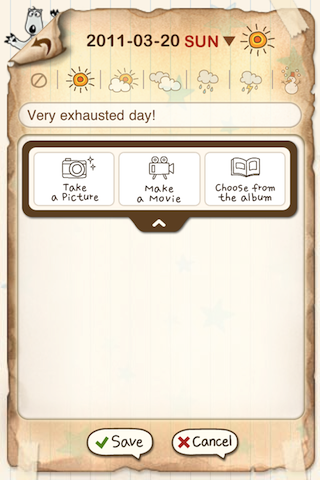 新增一篇日記吧!記下心情的點點滴滴外,Backkom還準備好多工具留下回憶喔!上方可調整新增時間,記錄天氣,打上標題之後,按一下向上箭頭的標籤頁,就會跑出三個選項來,可以「拍照」、「錄影」跟「用相簿照片」。