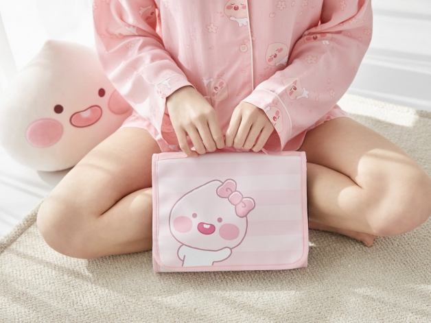 還有盥洗系列,旅遊專用可以放各種罐裝小物的盥洗袋,以及洗臉需要用的洗臉髮帶,上面都笑燦爛露大門牙的Apeach,浪漫櫻花粉色就是為「春天」誕生的顏色啊!