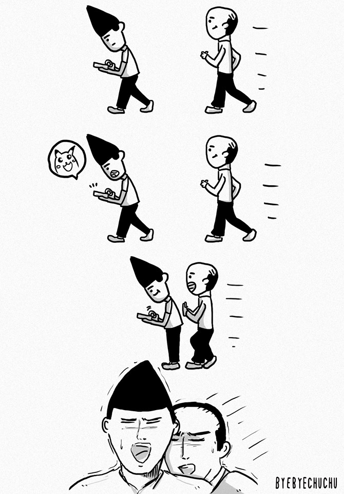 至於「尖頭男」的誕生,其實也是自然演化(?)而成的,掰掰啾啾說早期自己的角色都是頭髮向上抓的造型,直到某天有讀者告訴他說,他筆下的人物的頭髮居然一天比一天還高了(這位讀者是有每天用尺量嗎XDD),所以後來就出現了以「尖頭男」這個固定角色。