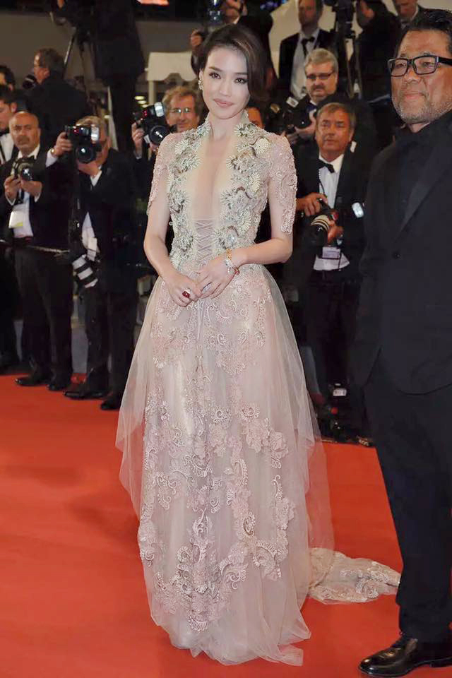 舒淇在出席《聶隱娘》首映時,身穿黎巴嫩設計師Reem Acra的刺繡透視禮服,用粉裸色、精緻刺繡和一層層的薄紗,配上辮子編綁髮型與淡雅的妝容,讓她好有仙氣,在紅毯上特別出眾。