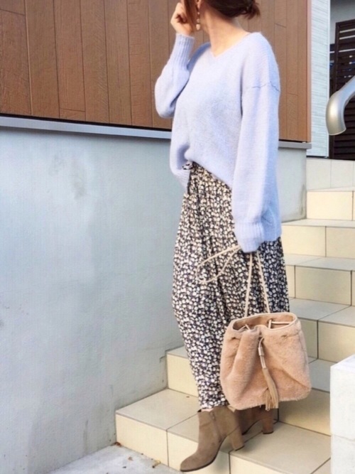 冬末初春,讓我們的穿搭也加熱些柔和溫暖的色系吧! 天藍色的粉嫩以及碎花的優雅混搭上毛質的單品是不是很有迎接春天的感覺呢?!