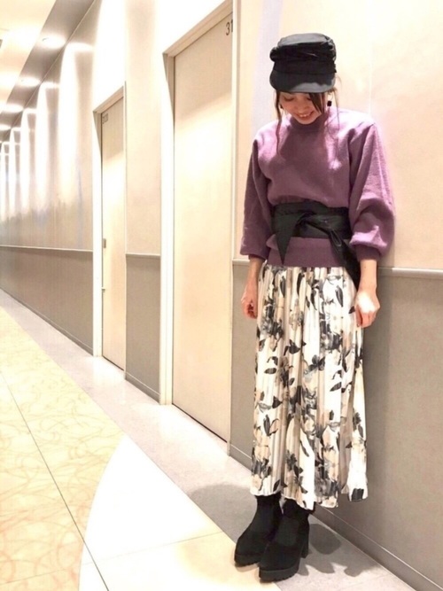 稍微淡點的紫色與花朵紋的單品也是絕配!再利用黑色小物統一整體造型,既有春天感又不失大人的成熟優雅~
