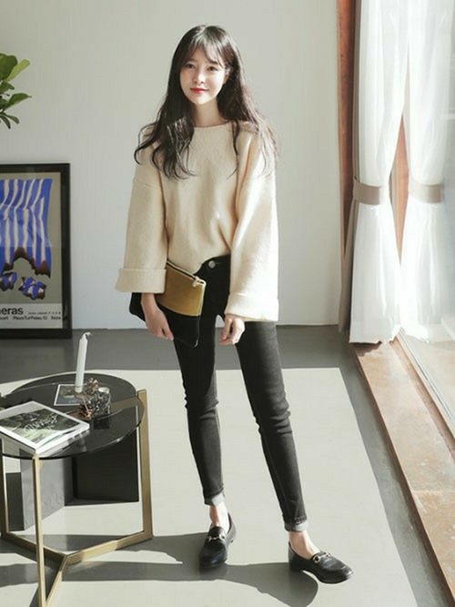 寬版的牛仔褲給人率性的感覺,加上俐落的黑色套頭毛衣以及乾淨的妝容,簡簡單單就能穿出街頭潮人的氣勢。