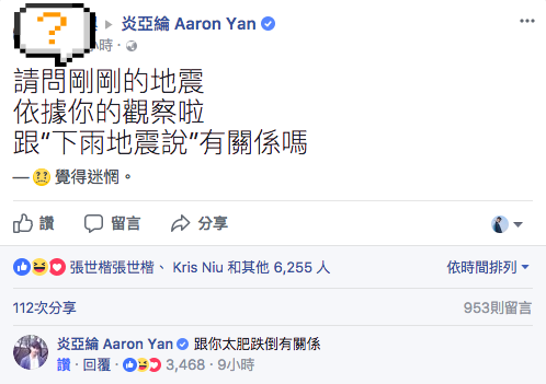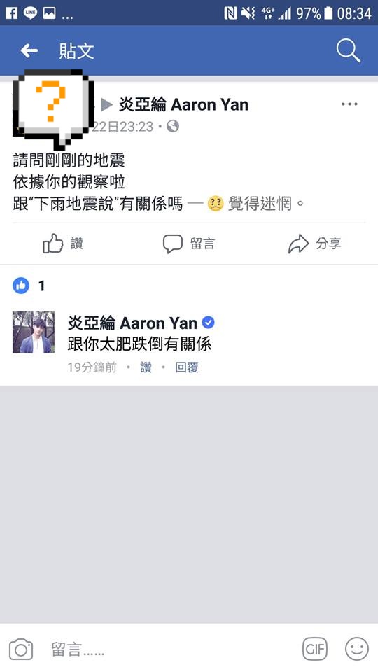 近日台北也是連日下雨,昨日(11/22)發生地震,一位李姓網友到炎亞綸的臉書貼文,「請問剛剛的地震,依據你的觀察啦,跟“下雨地震說”有關係嗎?」,沒想到炎亞綸竟然回說:「跟你太肥跌倒有關係」。