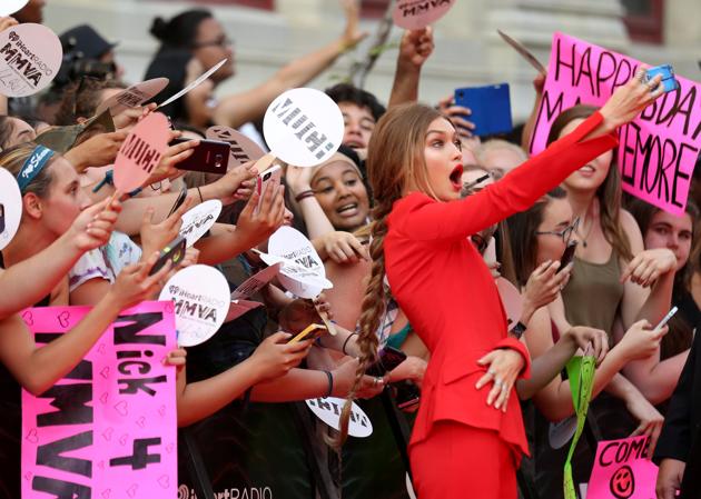 吉吉哈蒂德和場外粉絲大玩自拍,逗得粉絲不亦樂乎。