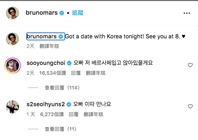 火星人布魯諾只要出歌必橫掃,2018年更直接抱回7座葛萊美獎成為最大贏家,在全球擁有大批死忠粉絲,這次在韓國開唱讓萬人直接擠爆蠶室奧林匹克主競技場,在演唱會當天稍早曬出的一則預熱貼文,更是「釣出超多藍勾勾回應」!AOA雪炫留下:「歐巴待會見」,少女時代成員秀英則是神回:「歐巴,我會穿著VERSACE坐在台下」,充滿粉絲狂色的發言引發爆笑,只能說火星人不愧是「偶像心中的偶像」~