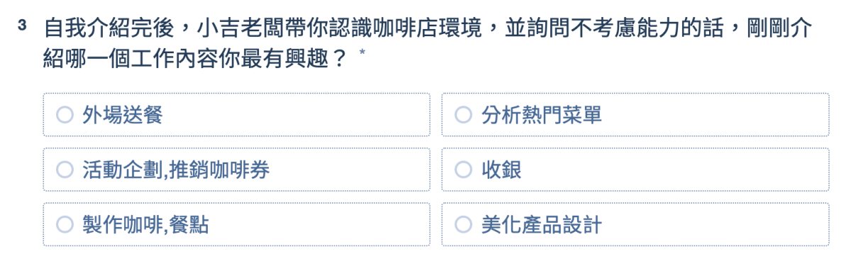 測驗將分為8個大題,首先先讓妞妞們想像自己來到了探吉汪星球,並要在這裡找一份工作,妞妞們可以依照測驗給的選項,一一找出最適合自己的形容詞,再根據工作所遇到的事情,回答自己的解決辦法,以及你最想跟怎樣的同事當朋友!
