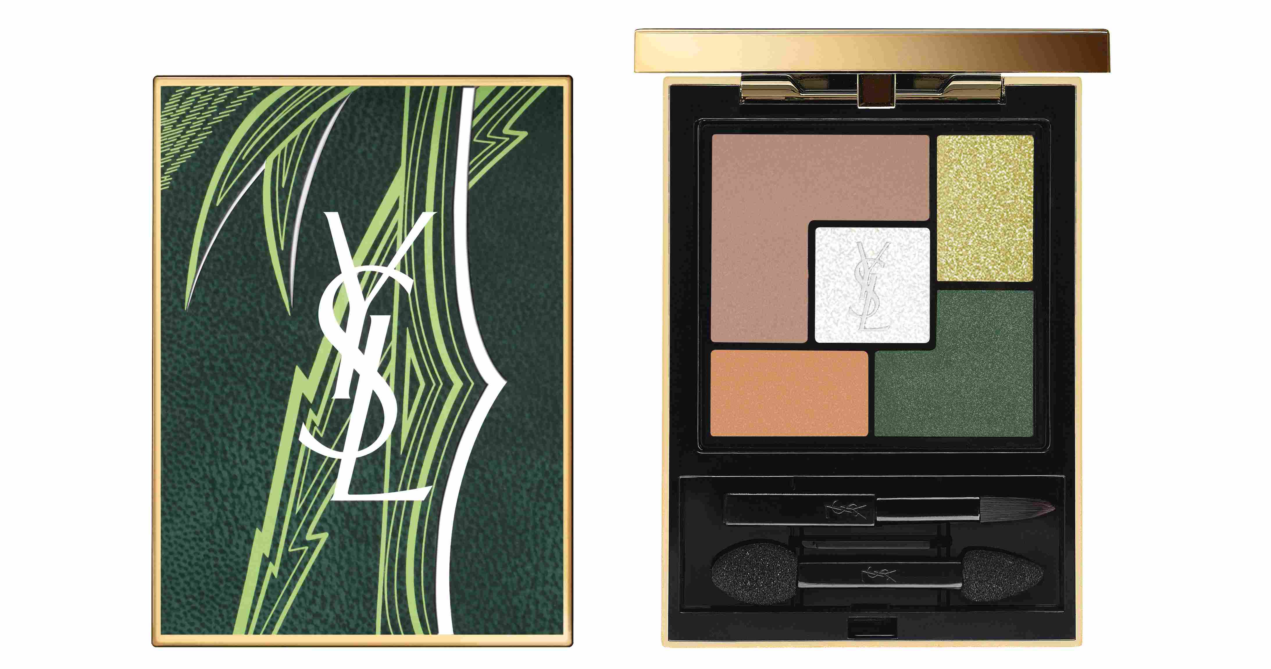 2019年YSL的夏妝主題為「綠洲覓境」,其設計靈感來自奧里卡花園,那是個綠意盎然的熱帶天堂,圍繞在蔥鬱青翠樹葉、蕨類植物蒼翠的葉子突然綻放赭色與橘色花朵,呼應YSL的獨特傳統:打破無聊!每季限定發售的拼接時尚五色眼彩盤,這次也換上艷夏的狂野色系,搭配細緻微璨光的金璨萊姆綠,能夠完美提亮眼眸。濃情熱帶綠可刷在眼線附近打造煙燻眼線效果。蜜桃橘則是為雙眼注入光澤與輕透感,帶著柔霧光的暖色銅,可使眼神更加深邃!最後燦光白搭配YSL CASSANDRE標誌,可用於眉下打底色或當作基礎打光色。
