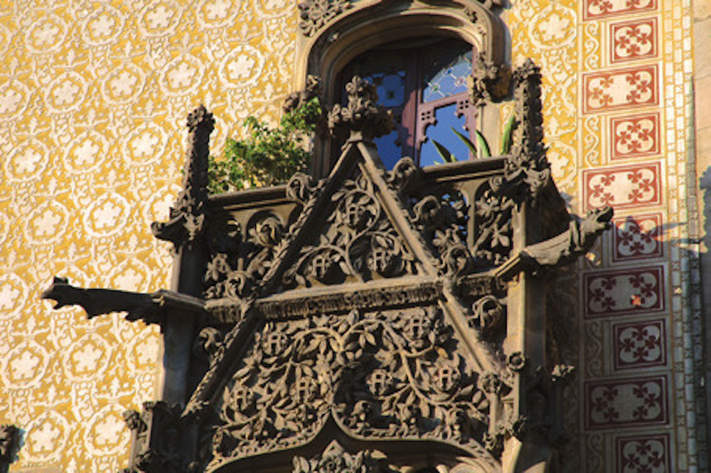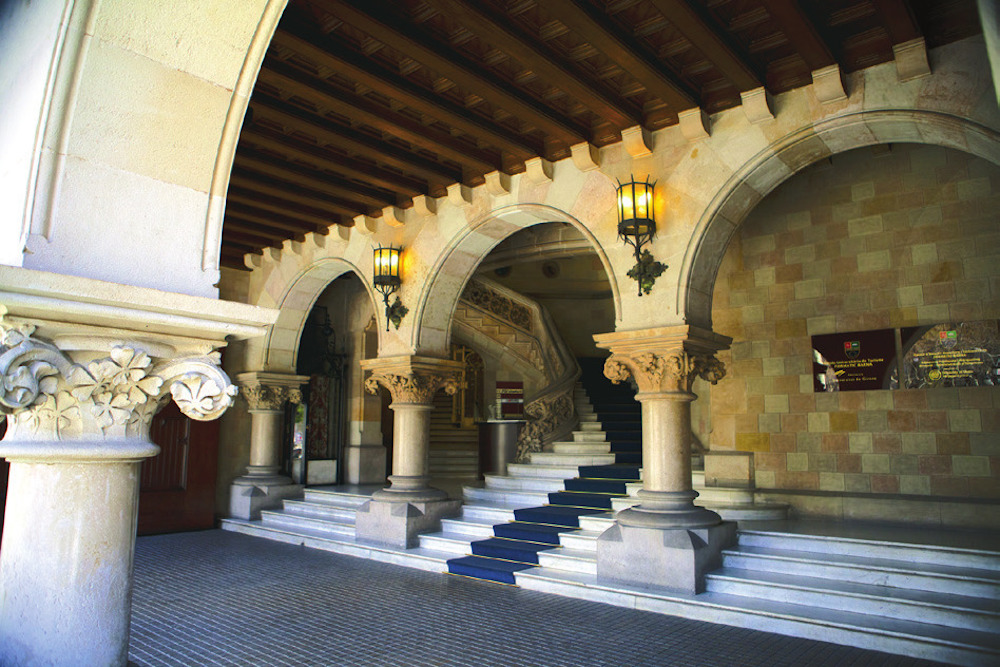 具新哥德氣息的加泰隆尼亞現代主義建築,最引人注目的地方在一樓的三個大拱門。穿過拱門,映入眼簾的是華麗的大樓梯,直通二樓。中庭上方有精美的彩色花窗玻璃,二樓突出的窗台精雕細琢,塑造出特別的立面。