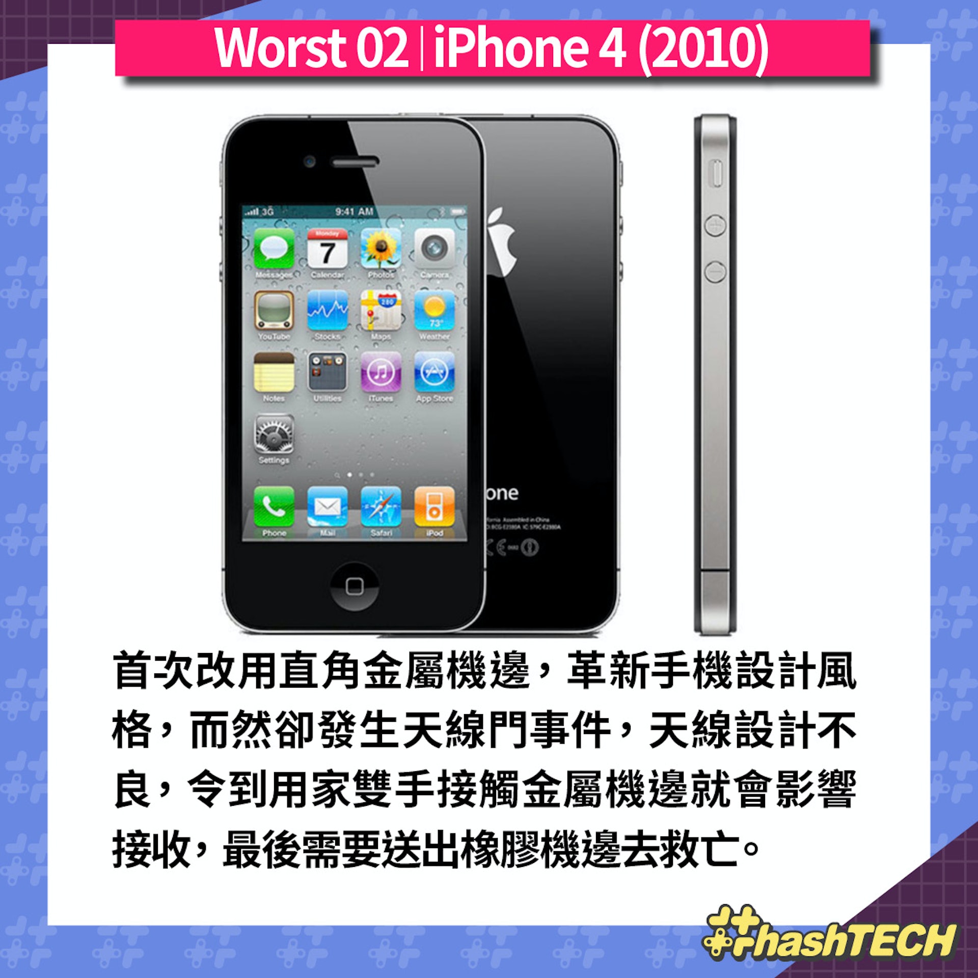 5款最差 iPhone 機型則分別為:4、SE、5C、6/6 Plus(當1部計)及極少人聽過的Rokr E1。5C被選為差中之差,塑料外殼雖然推動起iPhone多色機身選擇的先河,但使用過期舊硬件、外表廉價但定價並不便宜,一年不到已被Apple視為雞肋另一部,便是發生「天線門事件」、天線設計不良導致接收發生問題的iPhone 46與6 Plus的鋁製機殼用料單薄,導致很多人放進褲袋後坐得機身彎曲變形。至於SE雖然成功為Apple 打開平價手機市場銷情理想,但《Slash Gear》有講明「創新突破」為上榜條件,因而能夠理解SE被選的原因。