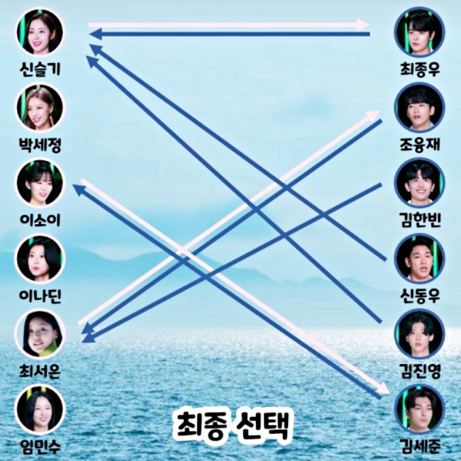 在第10集最終配對環節,東佑、鍾宇、珍映排排站告白,珍映終於直球坦言:「我好像喜歡你」,而一臉緊張的鍾宇開口邀約:「要跟我一起去喝咖啡嗎?」最後瑟基爆冷門選擇了「鍾宇」!!!不只鍾宇本人不可置信的又哭又笑,棚內著主持群也驚呆,最了解鍾宇心意的李多熙、Super Junior圭賢還因此感動到噴淚。