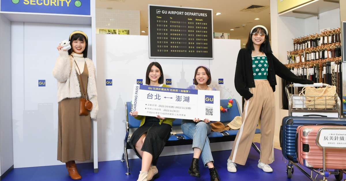 為了搶先讓大家體驗登機旅遊的心情,GU特別於台北ATT4FUN店打造「極優玩美旅程」情境拍照區,將機場大廳搬至店舖,擬真的機場情境彷彿下秒即可登機出遊!此外,慶祝「玩美針織系列」新上市,GU特別舉辦打卡活動,即日起到11/3至GU ATT4FUN店完成指定任務並拍照上傳,就有機會獲得台北至澎湖來回機票(1名)、GU「雙口袋短版開襟外套」(3名)。邀請所有時尚迷一起穿上玩美針織外套及時尚單品,發揮靈感、展現自己的初秋旅行時尚!