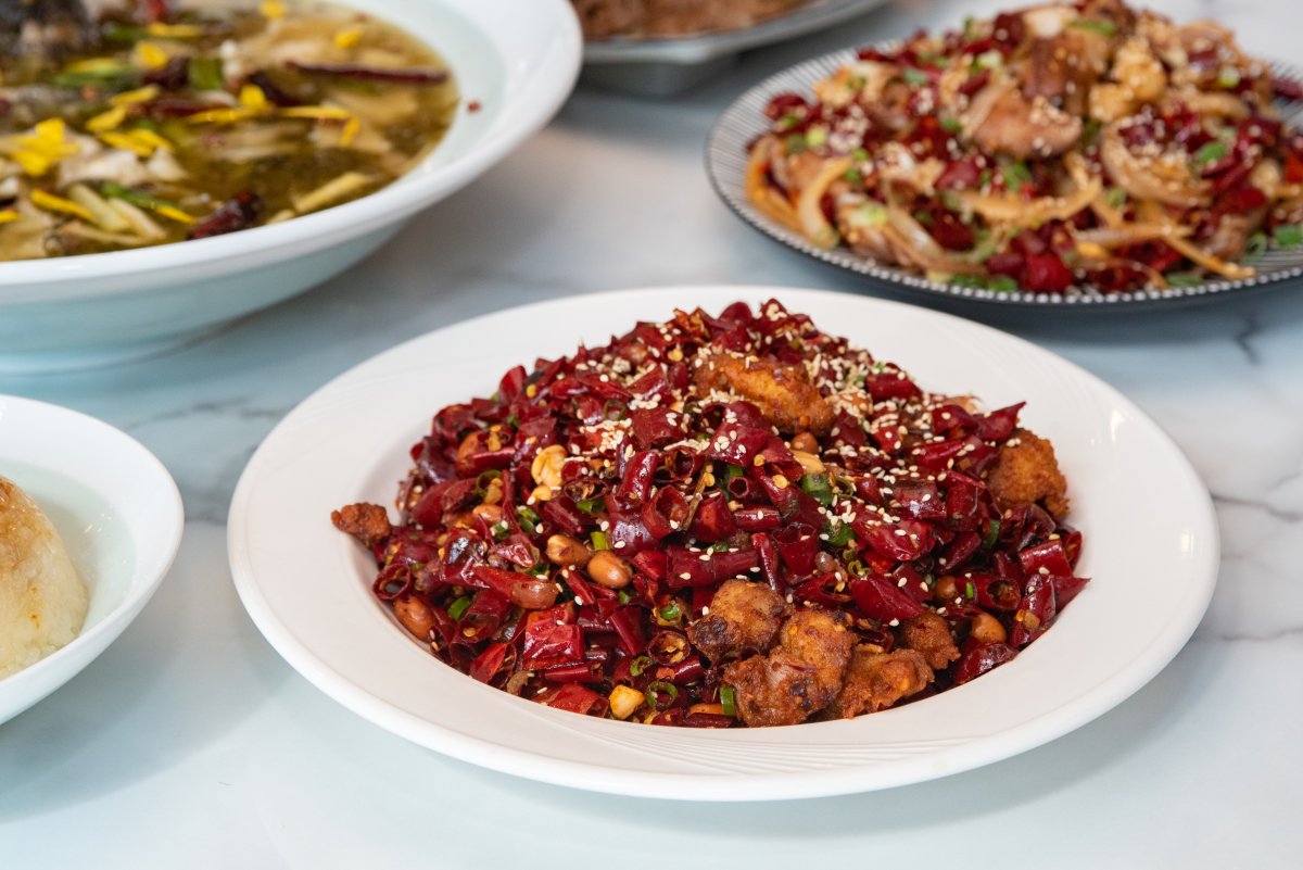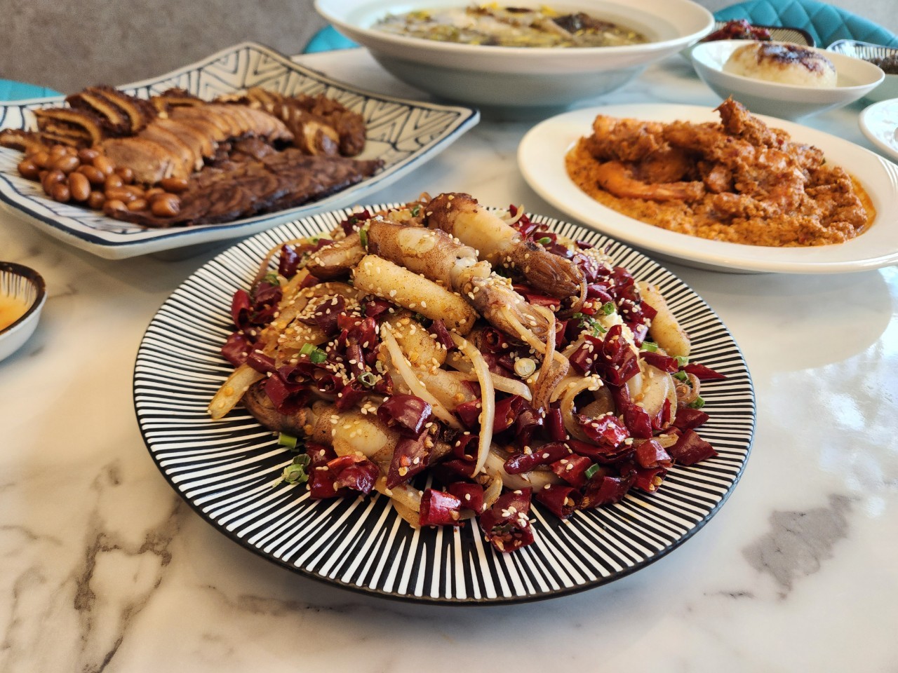 除此之外鵝川的「歌樂山辣子雞」也是人氣必點,酥炸雞腿肉、花生與大量辣椒一起翻炒,十分下飯。店內還有供應台灣極少見的四川傳統美食「甜燒白」,豆沙夾入肉片並以糯米裹滿外層,蒸至酥軟享用,鹹甜風味交織、口感軟糯,超特殊的風味好奇的妞妞們都可以試試。(師傅狂讚但⋯⋯妞編輯可能是吃不懂XD)
