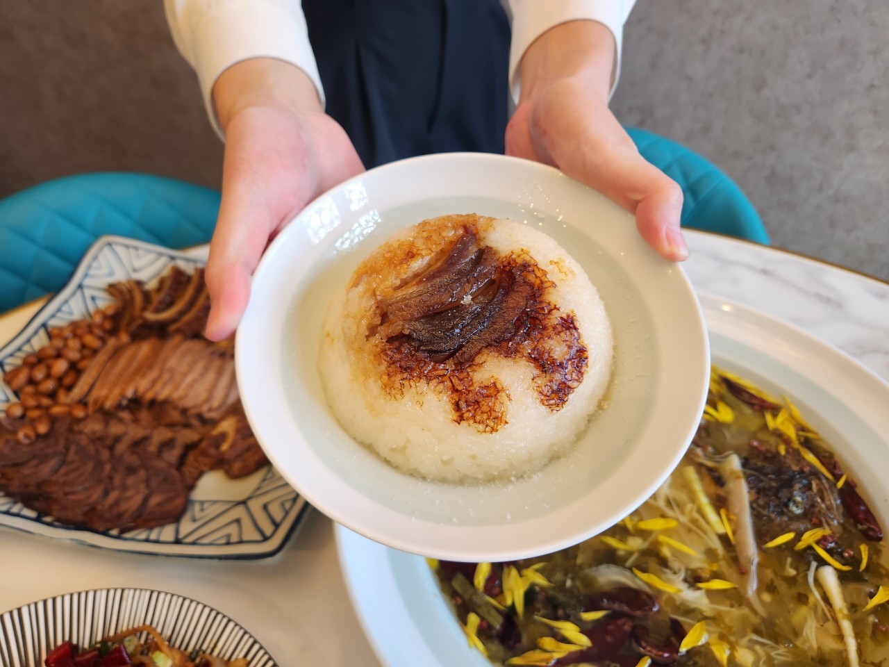 特別的是,鵝川的酸菜魚更放入酥炸魚頭,最後上桌前還會淋上熱油燙過的乾辣椒和花椒粒,使鮮味提升、香氣滿溢,酸香夠味且口感爽脆的酸菜搭配滑嫩的鱸魚肉片,視覺和味覺皆滿足!喜歡吃麻辣口味的妞妞,還可選擇「青花椒魚」及「麻辣水煮魚」。