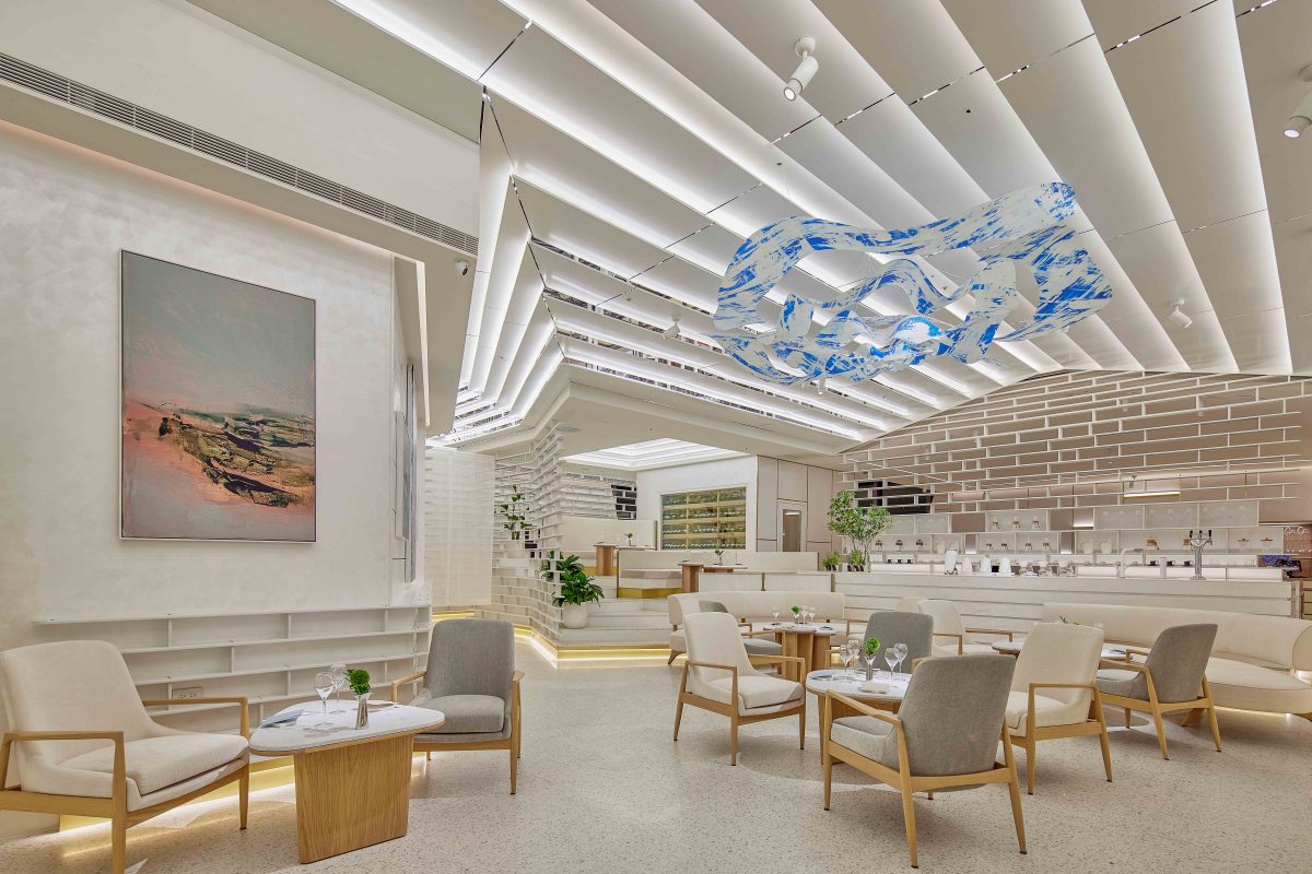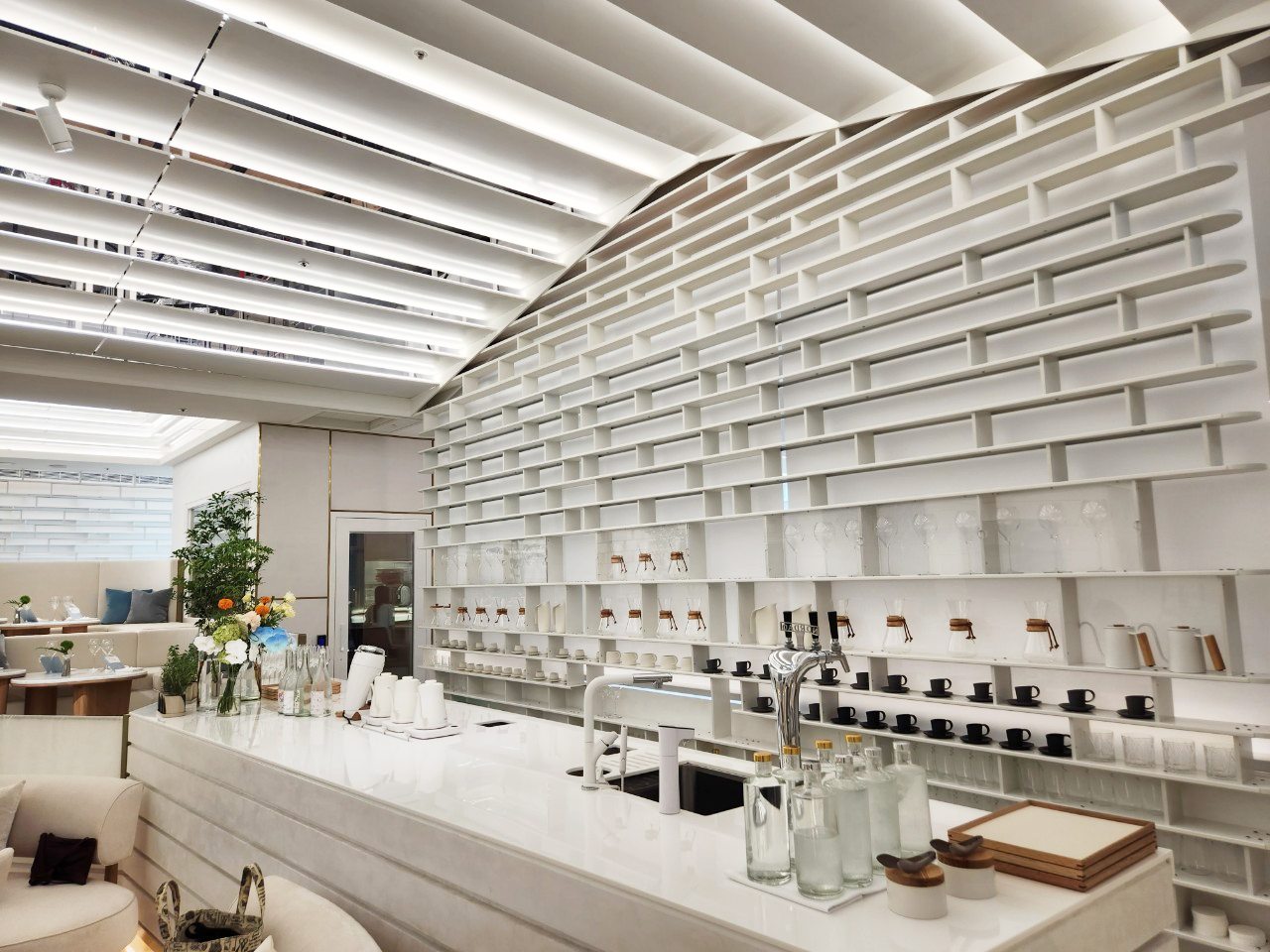 餐廳空間設計團隊是十禾建築師事務所,由建築師吳聲明和Chef Alain共同討論,以「See through restaurant」的穿透性和無我的概念發想,大片的落地窗與通透的空間設計,不時還能看到外頭的藍天白雲!純淨⾦屬光澤⽩件,搭配⾃然落地採光的亮⽩,和藝術⼿刷⽩漆,襯托出來到這裡的每一位賓客,讓Fine Dining的主角變成是用餐的客人。