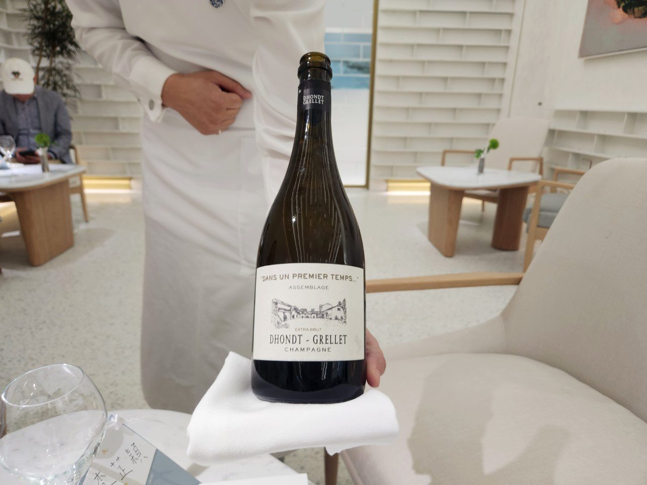 來到「A」⽤餐,會發現這裡的食器餐具都特別講究,從陶藝、⽯材到玻璃材質都呼應餐廳品牌設定,像是香檳吧區域的餐具用以當地的地貌、地景和⾹檳的意象呈現。並採⽤台灣本地永續⼤理⽯材,百分之百物料循環利⽤。就連菜單上所有的靜物插畫、夥伴的⼯作服、餐廳內專屬的香氛等等,都是由這些設計⼯藝家們親手設計的,
