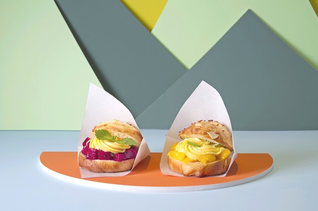 貝果甜心泡芙系列有輕檸芒果與百香蜜果兩種口味,豪爽地鋪上一整層的愛文芒果或火龍果,與絲滑綿密的卡士達醬一起入口,口感超級華麗,讓人享受甜而不膩的夏日滋味!