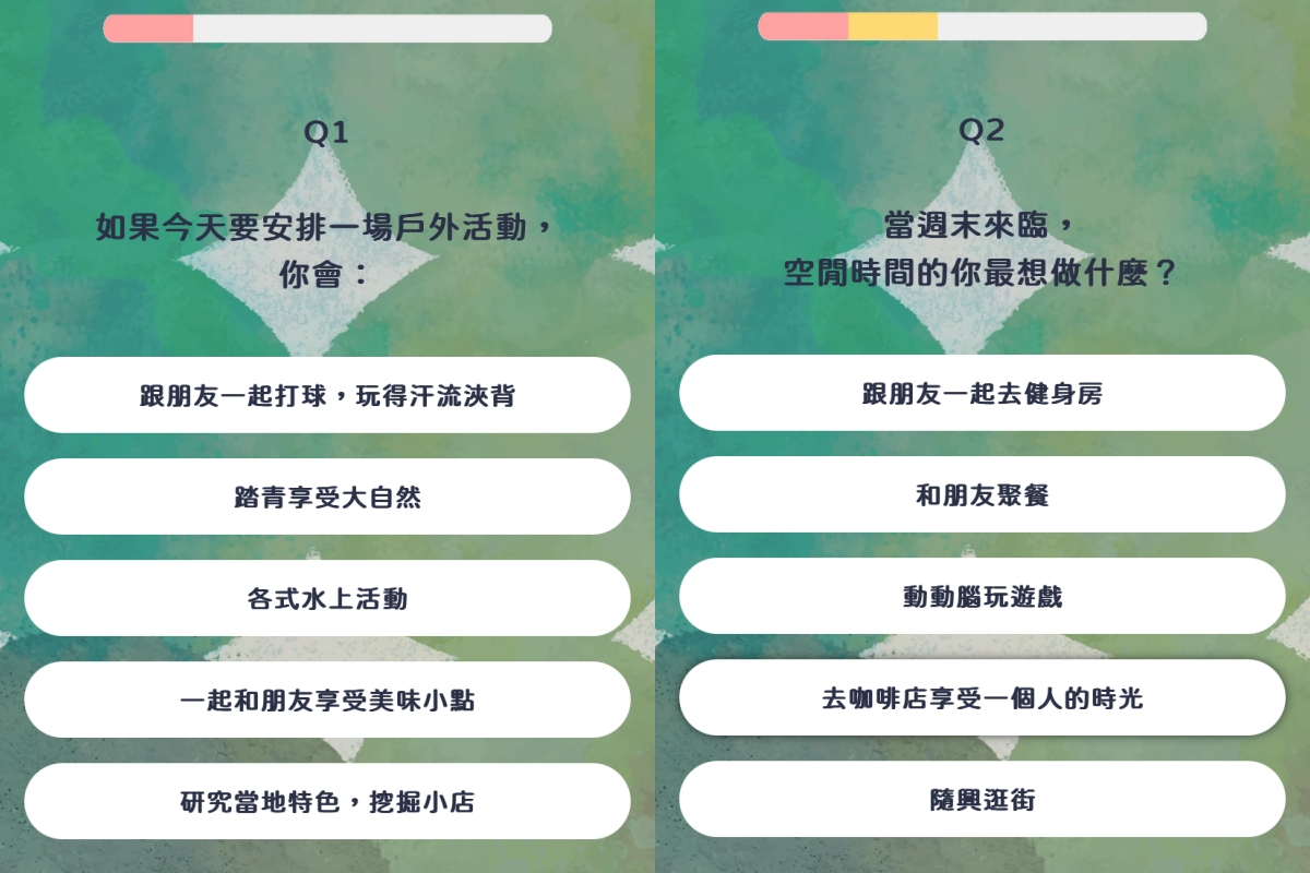 第一題,如果今天安排一場戶外活動,妞妞們會選哪一個?打球、享受自然、水上活動、分享美味小點或者挖掘小店第二題,週末來臨,空閒時間最想做什麼呢?哎呀妞編輯選不出來,每個都想嘗試(笑)