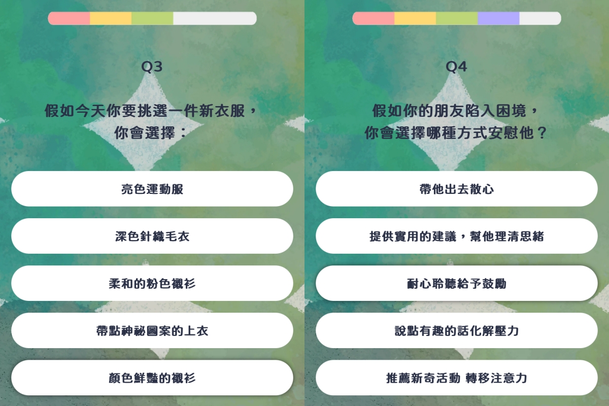 歡迎妞妞們來到「色彩鑑定所」~透過一場體驗、5道題的方式,快速測出自己的「隱藏人格」到底是什麼。是團隊裡沈穩的智者「焦糖咖啡」,又或者是活力滿滿的「柳橙黃」,超有趣的心理測驗,大家一起來玩~