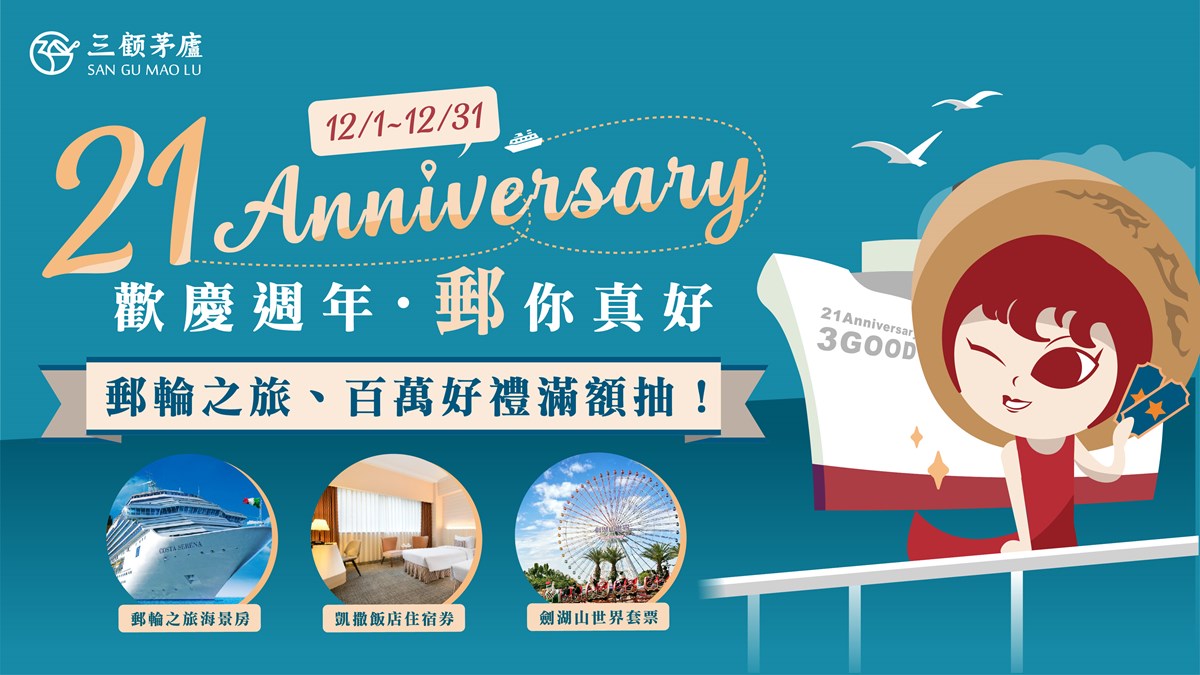 為迎接21週年慶,三顧茅廬2024規劃為期一個月的「郵你真好」週年慶活動來回饋長年支持我們的顧客,獎項包含奢華郵輪雙人旅,台北凱撒大飯店精緻雙人房、饗食天堂下午茶券、劍湖山雙人票券、北投春天酒店泡湯券、三顧茅廬精選美食鴨血/豆腐免費吃、人氣潮流HYDY保溫瓶品牌等、時尚3C科技產品!