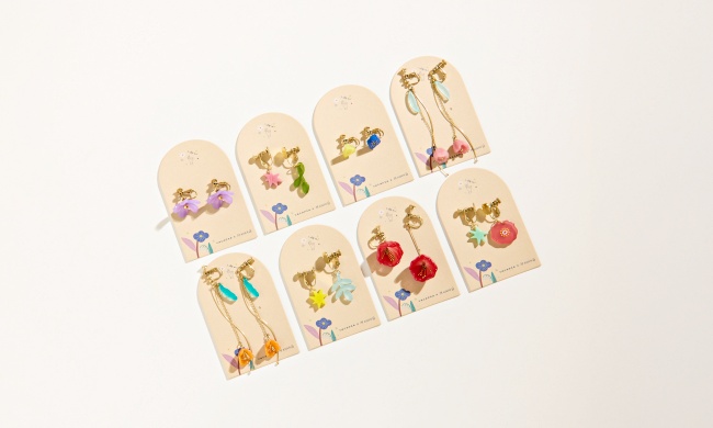 vacanza× 插畫家阿薛聯名 浪漫紫花・純鋼夾式耳環(有耳針款) NT.880/藍黃小花・純鋼夾式耳環(有耳針款) NT. 680/紅花綠星・純鋼夾式耳環 NT. 780/綠葉粉星・純鋼夾式耳環NT. 780/綠葉黃星・純鋼夾式耳環NT. 780/不對稱紅花垂掛・純鋼夾式耳環 NT. 980/熱情橘花垂墜・純鋼夾式耳環NT. 980優雅粉花垂墜・純鋼夾式耳環NT. 980