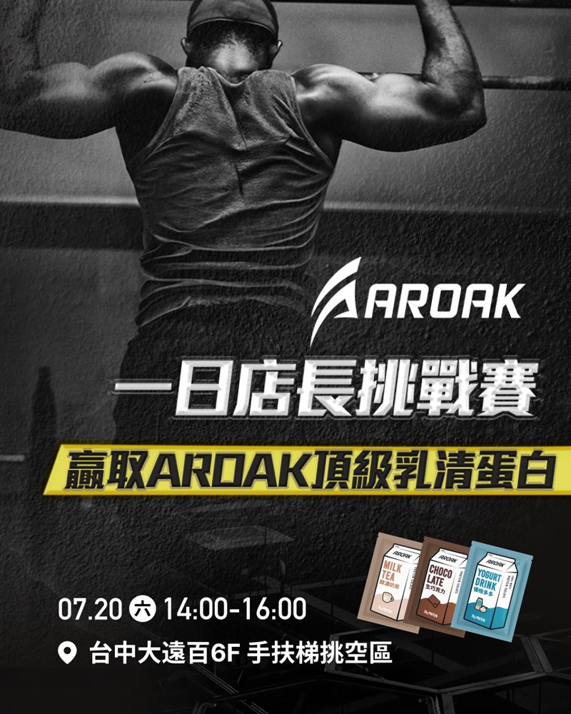 另外,8月3日 AROAK快閃店舉辦了二頭彎舉挑戰賽,邀請了健美選手萬師傅、馬克以及知名網紅Ferry到快閃店擔任挑戰賽的關主。當日只要來櫃位上面打卡,就可以獲取參加挑戰的資格,只要贏得挑戰打敗關主,最高可以獲得一個月份的乳清蛋白粉 !