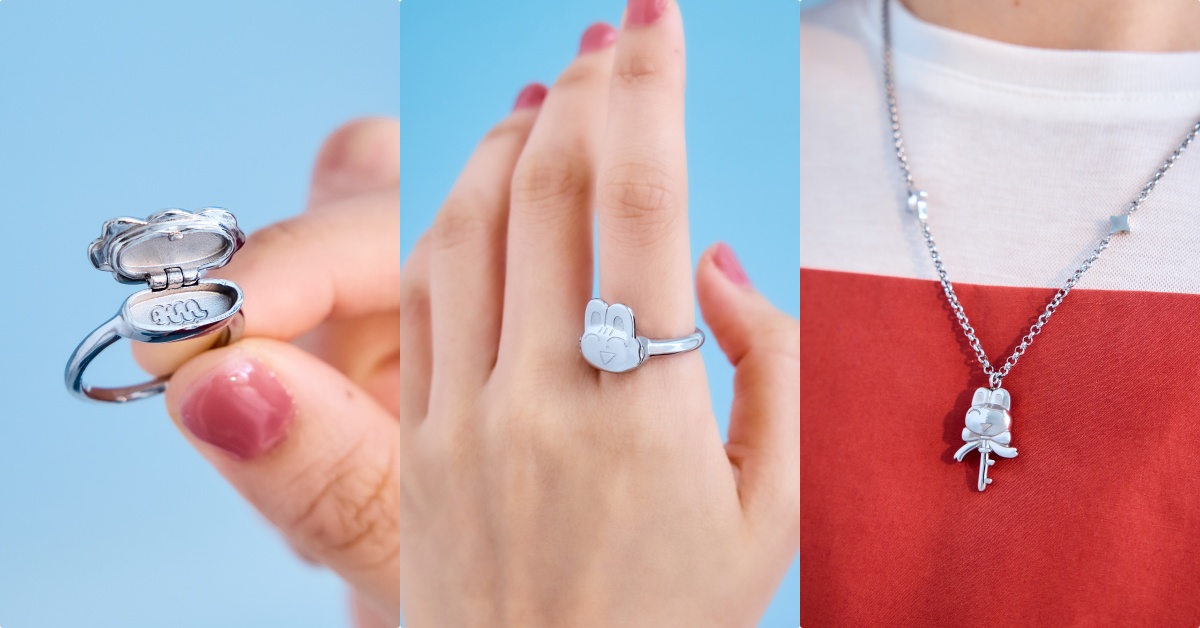 除了跳跳兔、三胞胎小兔等noii noii筆下的經典可愛兔兔角色,也可以看到idog狗狗、SOSU松鼠、小花咪子的身影,從全系列飾品皆採用純鋼材質製作,抗敏易保養,敏感肌膚的妞妞們都可以美美地又安心戴上,像是聯名純鋼項鍊以小兔鑰匙搭配星芒造型呼應此次開啟魔法假期的主題,妞編輯大推「掀蓋純鋼戒指」,真的可以打開,裡面藏有小彩蛋喔~