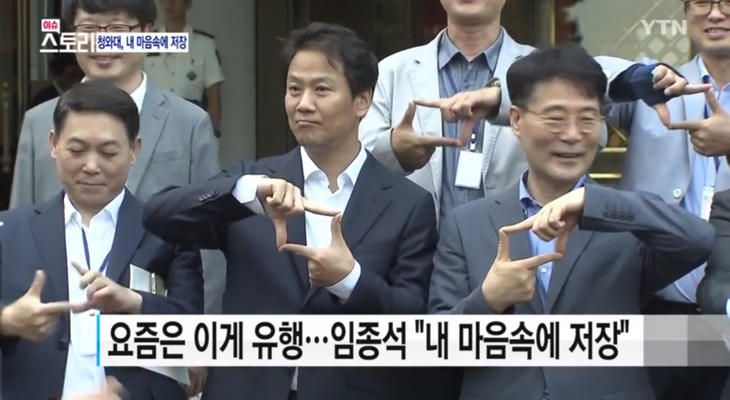 除了偶像版本的「在我心中收藏」之外,韓國竟然連嚴肅的政治人物都淪陷了!韓國總統文在寅在青瓦台前和其他的官員合照,竟擺出「收藏pose」,西裝筆挺的官員們深陷流行語魅力,左看右看確認自己有沒有擺好,合照結束之後還意猶未盡的討論一番。
