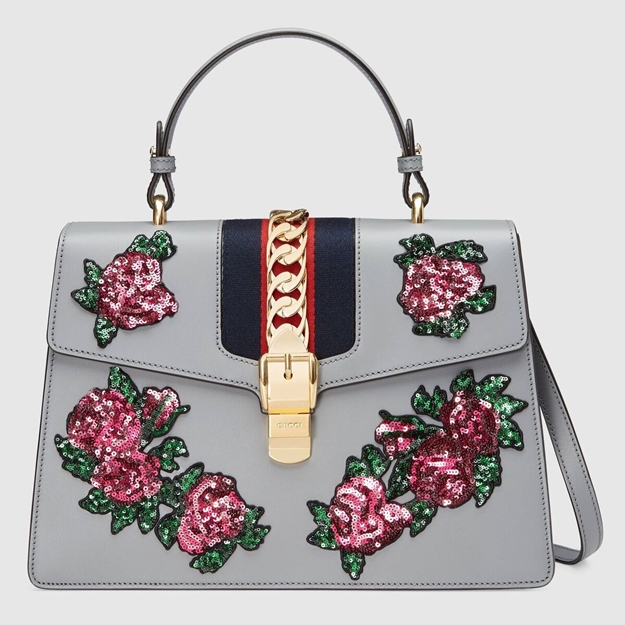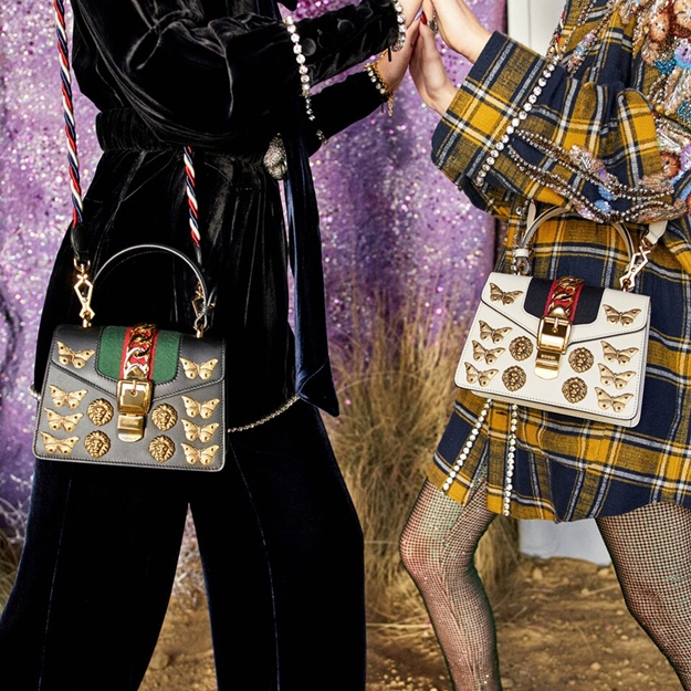 設計靈感大都源自馬術文化的 Gucci,取材自固定馬鞍於馬背上的"馬腹帶",打造經典的綠紅綠織帶標誌。Sylvie 包款是創意總監 Alessandro Michele 上任後,Gucci 重新出發的當代設計之一,為品牌最著名的織帶紋飾再次表現出創新與創意。醒目的綠紅綠/ 藍紅藍織帶作為設計主軸,從包身上的羊毛面料至蝴蝶結繫帶提把裝飾,輔以別具新意的金屬鍊帶及鎖釦造型,打造 Sylvie 簡約隨興卻前衛雅致的都會樣貌。