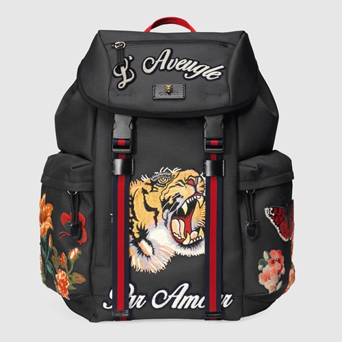 TECHPACK系列呈現了創意總監Alessandro Michele眼中的街頭風格,每款後背包均飾以源自酒神傳說的迷你虎頭,雙肩背帶與袋身上綴有品牌知名的雙色織帶。其中一款拼貼虎頭與花卉刺繡、以及取自法國知名女作家文學創作中「L’Aveugle par amour(為愛盲目)」標語的後背包,最能展現GUCCI浪漫偏執的時尚哲學。