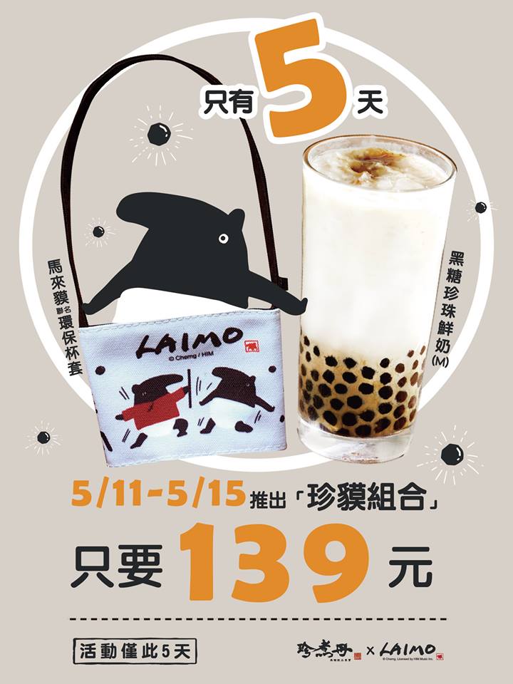 到全省門市購買指定款「黑糖珍珠鮮奶中杯」+「馬來貘聯名環保杯套」優惠價NT.139。