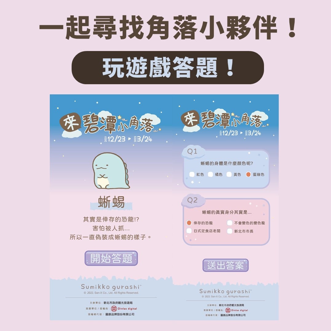 活動期間只要在碧潭周邊找到角落小夥伴QR Code,掃描答題並完成遊戲,並來到即可參加抽獎,前來「新北旅客」的官網貼文打上指定文字並標記朋友,就可以有抽療癒玩偶的機會啦,活動一共有三波,誰會是那位幸運兒呢~