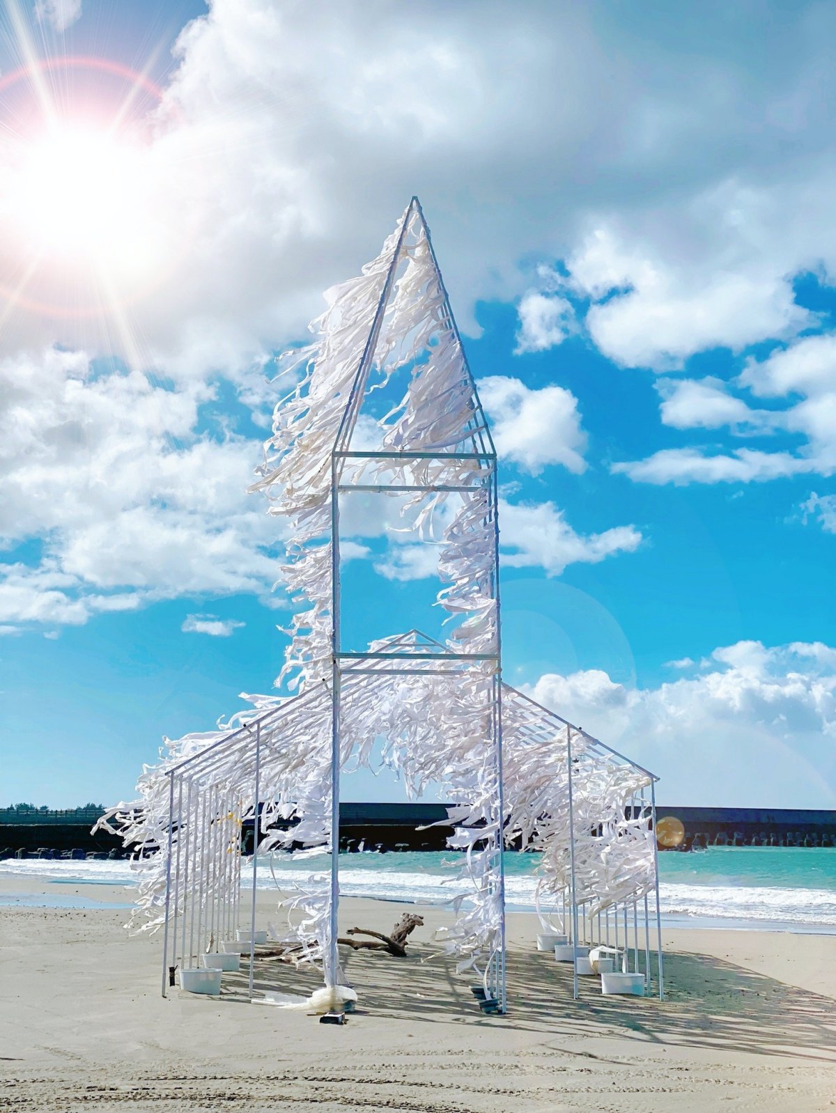 首先是位於「海口沙灘」的14件作品,由「范承宗」製作的《風來了》,在結構間裝設了圓形金屬葉片,因海風的吹拂而搖曳、旋轉,讓人越看越療癒~還有「禹禹藝術工作室」的小白屋《等一處風景》、「朱志康」所建造的佇立於海邊的教堂《來自海上的祝福》,都是妞妞們不可錯過的必拍展品。