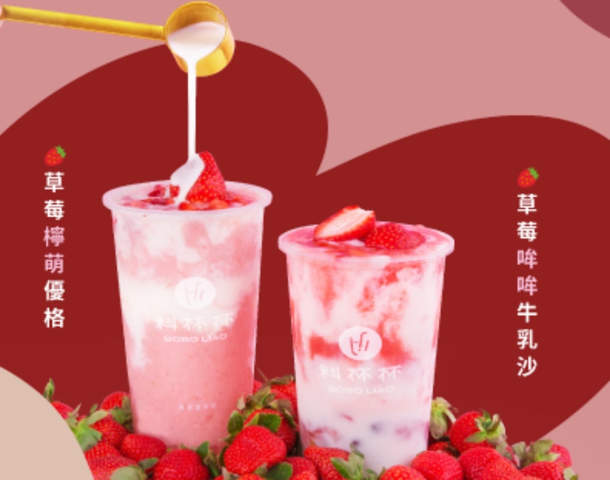 豐富配料、多重咀嚼感風格的飲料店「料杯杯」,超罪惡草莓限定爆料飲品「草莓哞哞牛乳沙」,嚴選大湖新鮮草莓搭配優格、鮮奶,加入了QQ粉水晶、彩小芋啵啵及鮮奶麻吉等豐富配料,每一口都是滿滿莓果香又能滿足咀嚼感!還有「草莓檸萌優格」則是選用原味寒天、QQ粉水晶鋪底,接著倒入青檸醬混和草莓汁打成綿密雪泥,最後淋上無糖優格,口感酸甜又清爽。