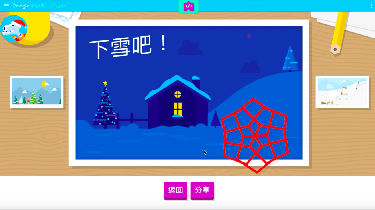 在這一款小遊戲中,用戶可以製造出自己的雪花~沒有標準答案,只需依照個人喜好放上程式碼,系統就會自動產出屬於自己、獨一無二的雪花。