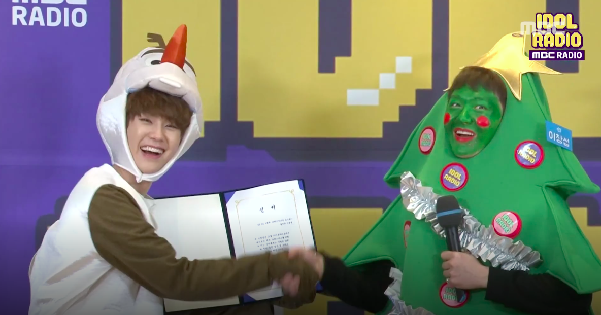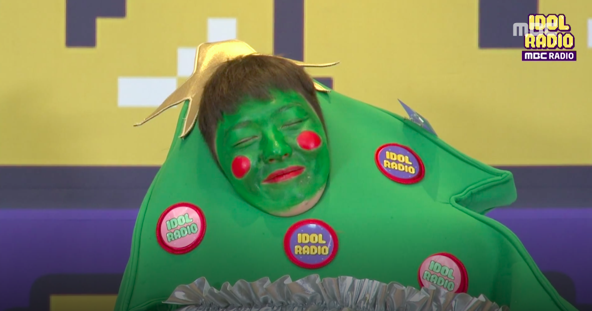 由BTOB成員「鎰勳」擔任DJ主持的電台節目《IDOL RADIO》,在昨天平安夜播出聖誕特輯,請來了神秘的特別嘉賓(?)同團成員「昌燮」,沒想到是一顆聖誕樹背對著觀眾「螃蟹式」踩著禮物走進場,轉過來一張大綠臉馬上引發尖叫(笑哭),那圓圓的腮紅、那紅唇…樹上還貼心地貼上IDOL RADIO的貼紙~