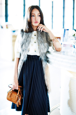 上衣紮進高腰裙縮短上身,外搭長背心也不怕變五五身。