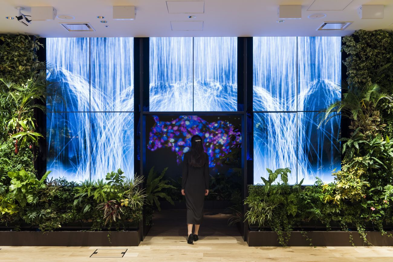 辦公室的入口是一座數位瀑布,穿越之後,迎面而來的則是一片寬闊的室內叢林。銀白色的數位瀑布,會隨著員工進出,出現不同的簾幕變化,而且景象一整天不會重複!