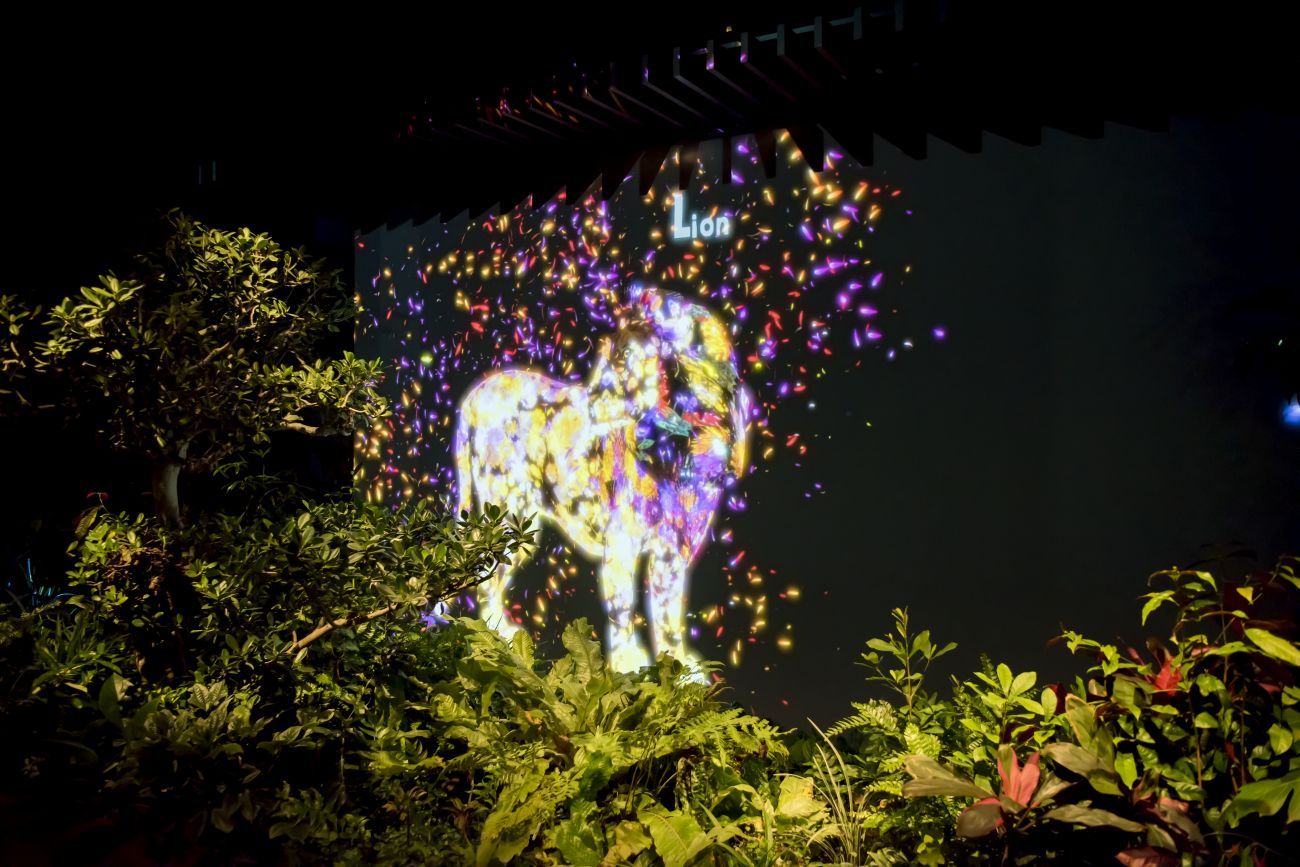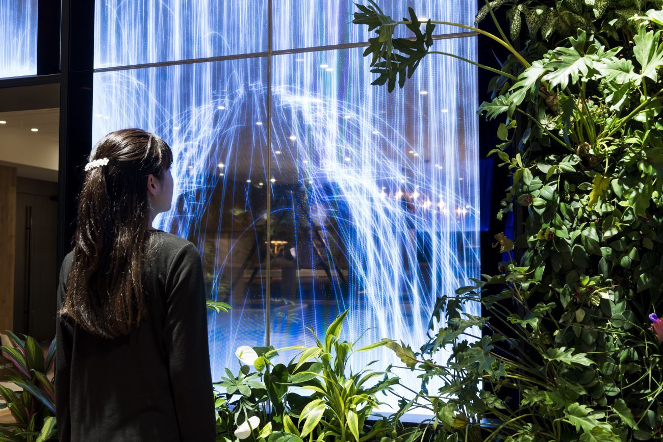 如同叢林般的長廊,有許多綠色植物,在牆面上還會跳出各種「珍奇異獸」,總共有26種動物,會帶領著人跟隨牠們的腳步,前往安排好的會議室。原本平淡到有點枯燥的辦公室,因為這些互動式的數位科技,夢幻的光影呈現,讓每天的上班充滿驚喜。
