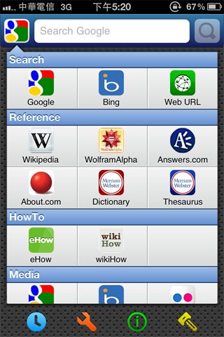 操作的方式很簡單,就像一般的網頁搜尋一樣,不過搜尋引擎都先幫你設定好了,你只要點選你想要使用的搜尋引擎,再輸入搜尋關鍵字,就可以使用了!