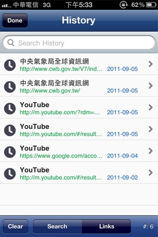 第一個鈕是歷史紀錄,其中包含曾經輸入過的內容和曾經瀏覽過的網頁。