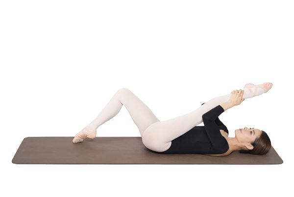 動作3:腳掌呈現立足尖姿勢後,用手抓住腳踝。將整條腿往身體方向拉,來回8次。