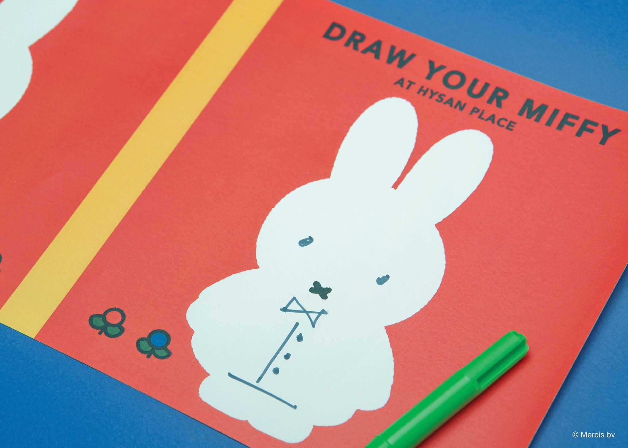 這次活動比較特別的,除了是供人拍照的立體公仔外,在HYSAN PLACE一樓中庭另外有「THE MIFFY HOUSE互動專區」。只要在利園區以電子貨幣消費滿$50,就可以在這裡繪製專屬的米飛兔喔!